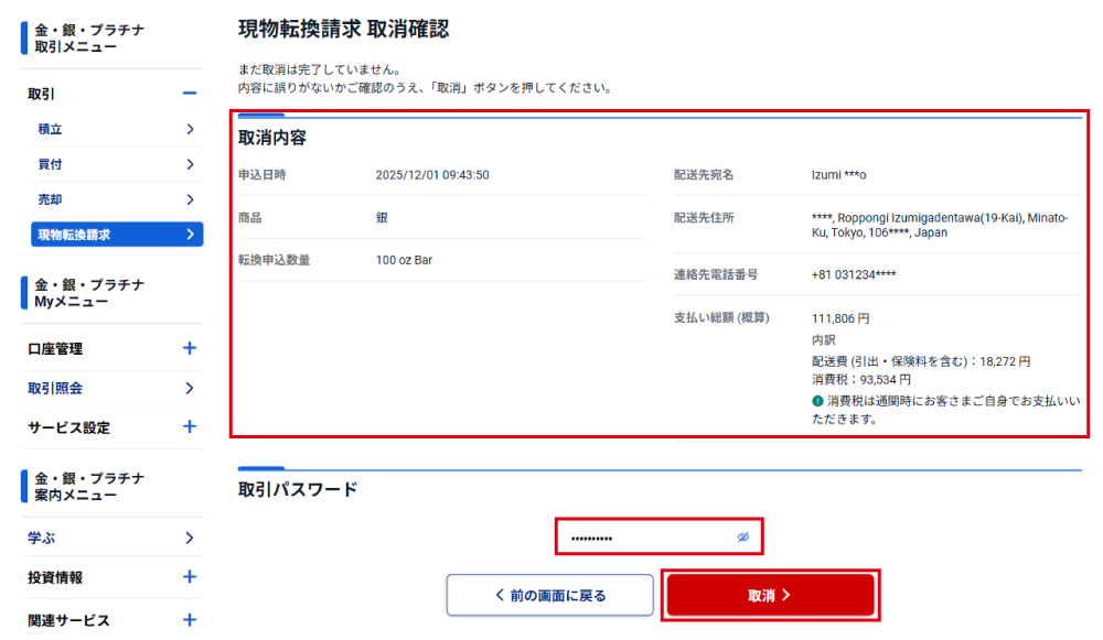 - 3. 内容を確認し、取引パスワードを入力して、「取消」ボタンをクリックする