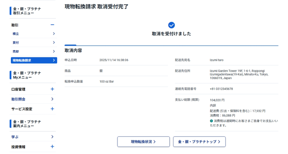 - 2. 対象の現物転換請求の「取消」ボタンをクリックする