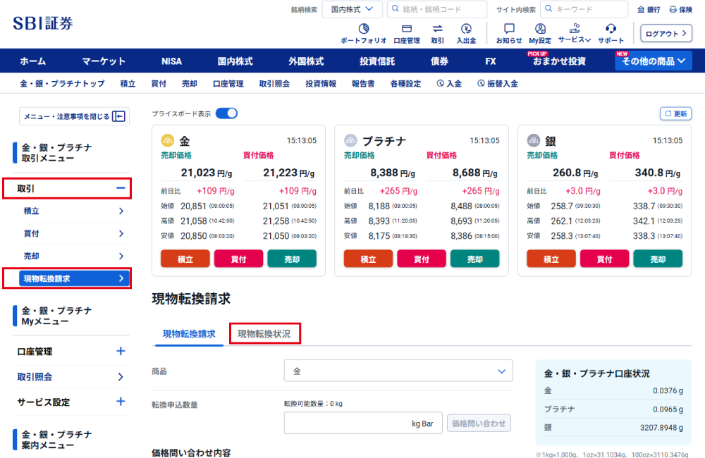 - 1. サイドナビの「取引」-「現物転換請求」をクリックし、「現物転換状況」タブをクリックする