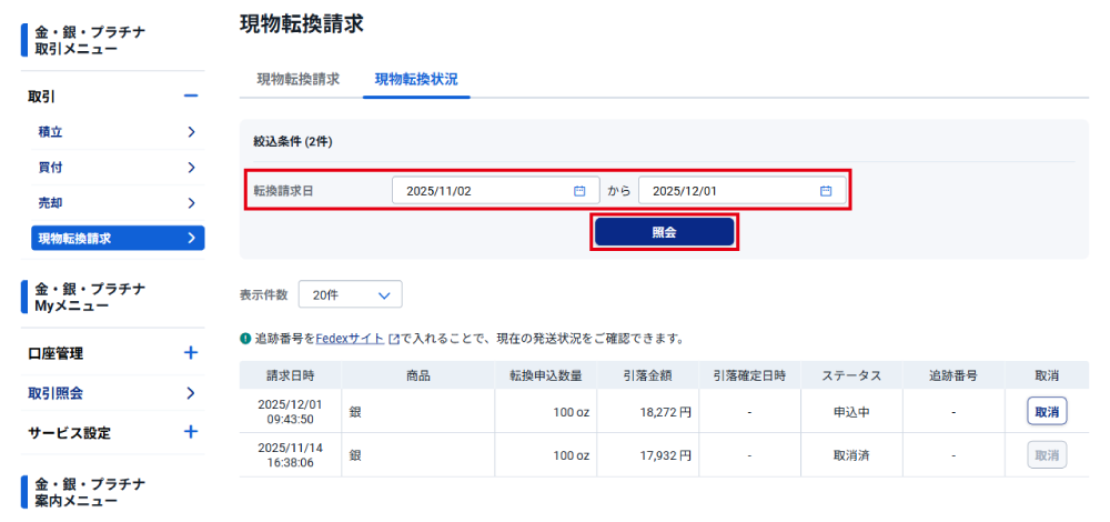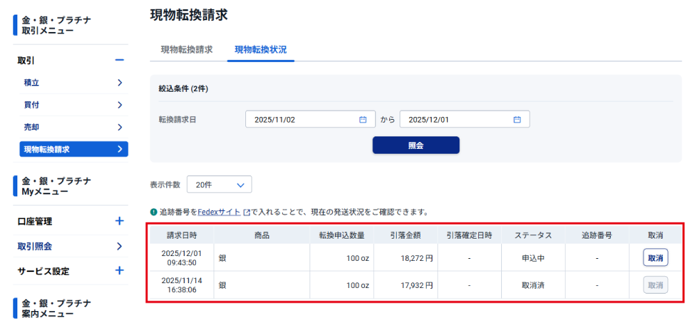 現物転換請求の請求履歴、および、現在の受付状況を確認できます。