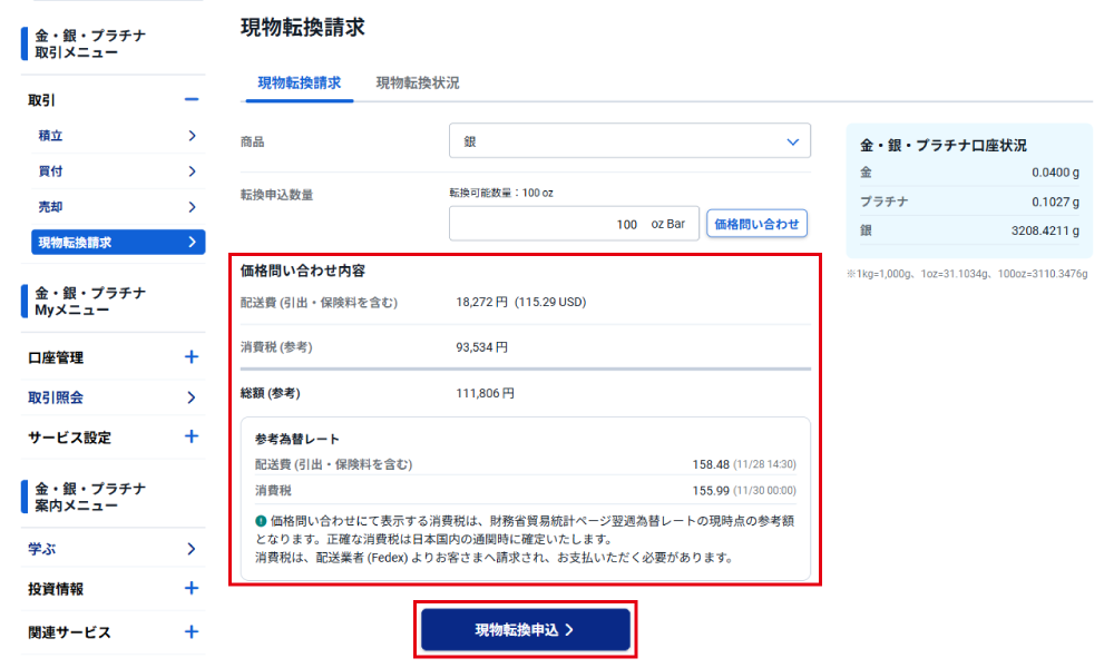 - 3. 現物転換にかかる概算費用を確認し、「現物転換申込」ボタンをクリックする