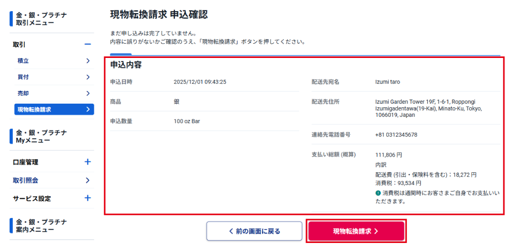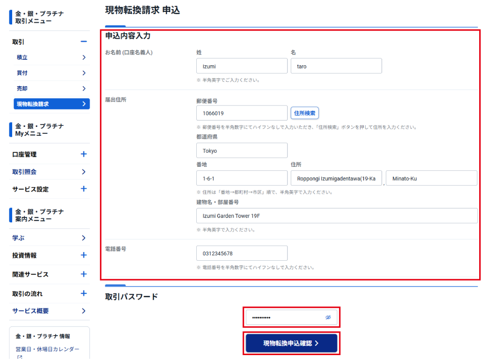 - 4. 配送先を入力し、取引パスワードを入力して、「現物転換申込確認」ボタンをクリックする