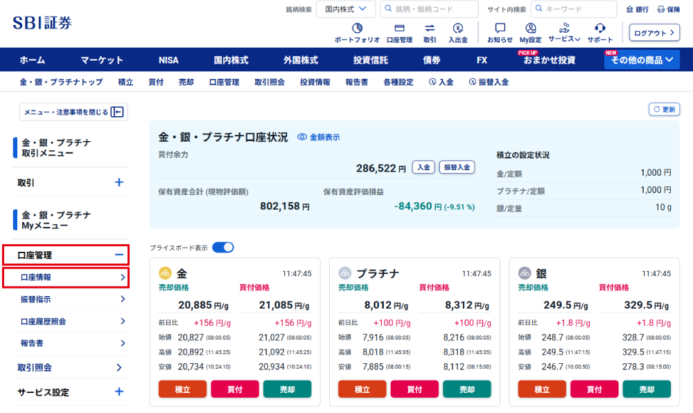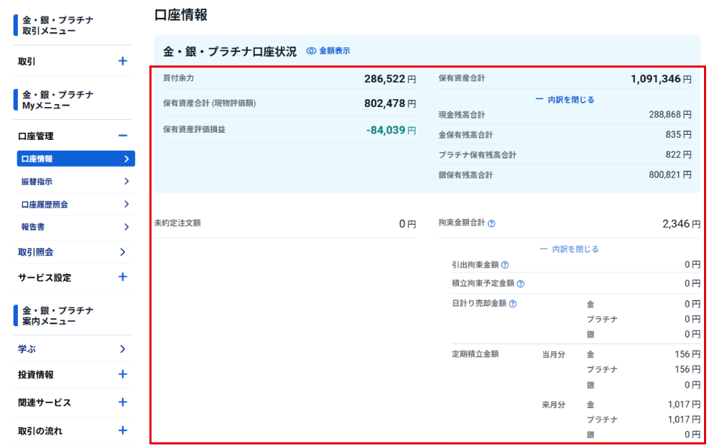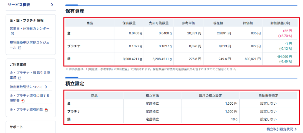 金・銀・プラチナ取引口座の口座状況、保有資産、積立設定を確認できます。
