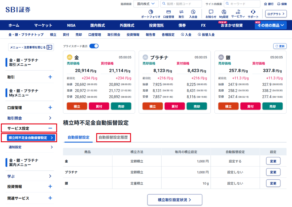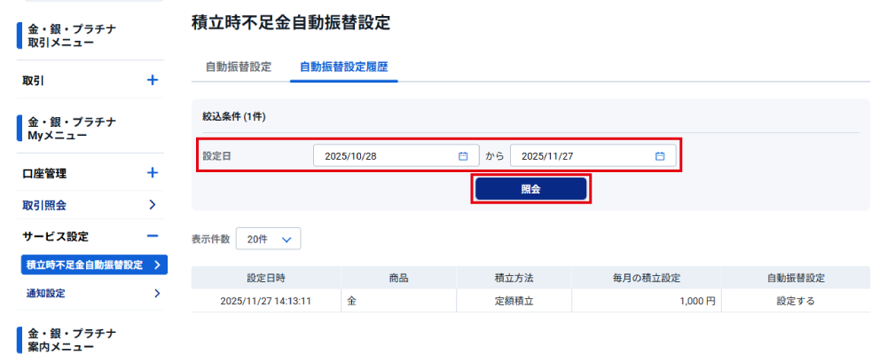 - 1. サイドナビの「サービス設定」-「積立時不足金自動振替設定」をクリックし、「自動振替設定履歴」タブをクリックする
