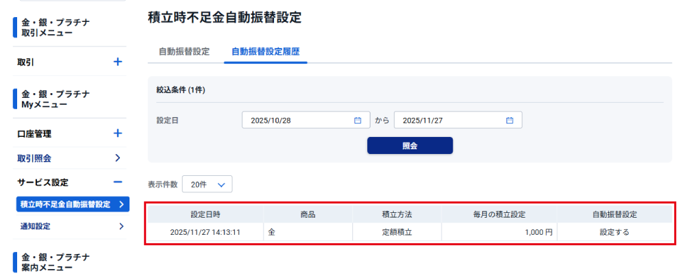 積立時不足金自動振替サービスの設定履歴を確認できます。