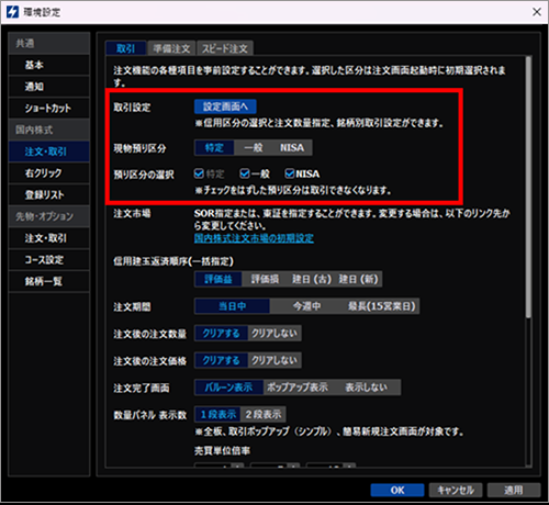 ここでの設定は、取引画面の初期表示に反映されます。