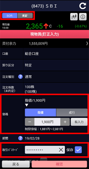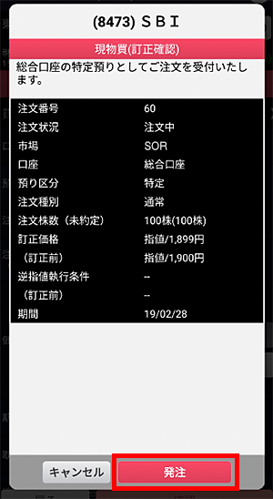 注文を訂正し、取引パスワードを入力して、「確認」ボタンをタップする