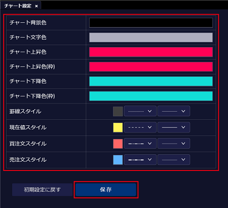 チャートの背景、文字、ローソク足の配色や、罫線や現在値ラインの太さなどを変更できます。