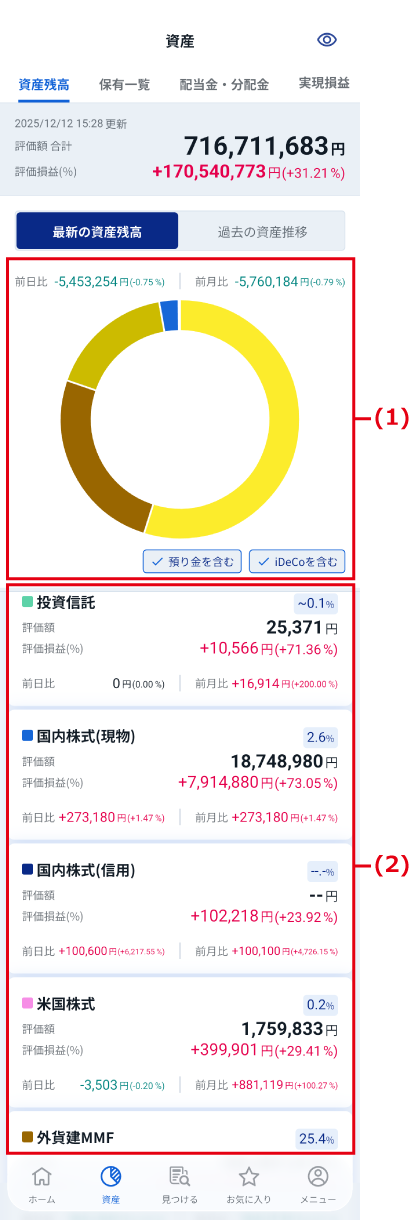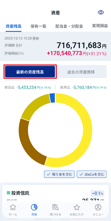 サークルチャートをタップすると、各商品の評価額、資産構成比、前日比/率、評価損益を確認できます。