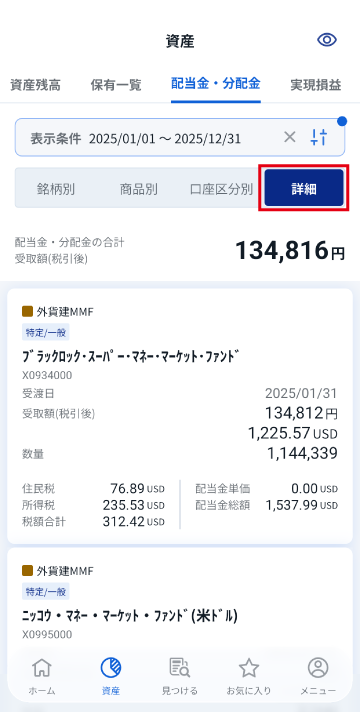 「資産」画面の「配当金・分配金」画面で、配当金・分配金の詳細を確認できます。