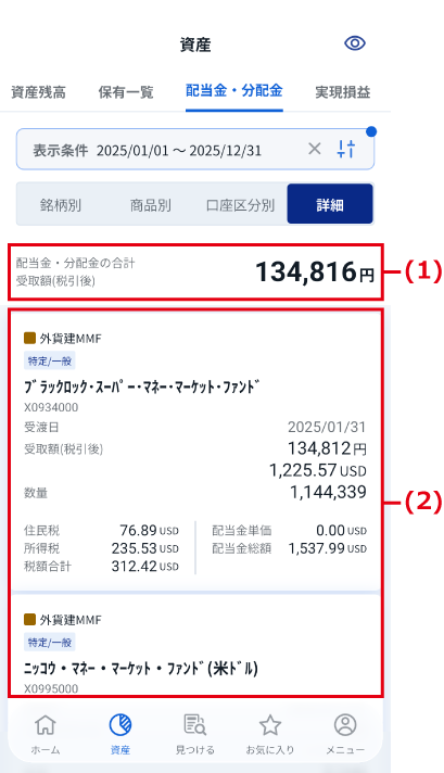 - 商品別の配当金・分配金の詳細情報については、「配当金・分配金の詳細情報」を参照してください。