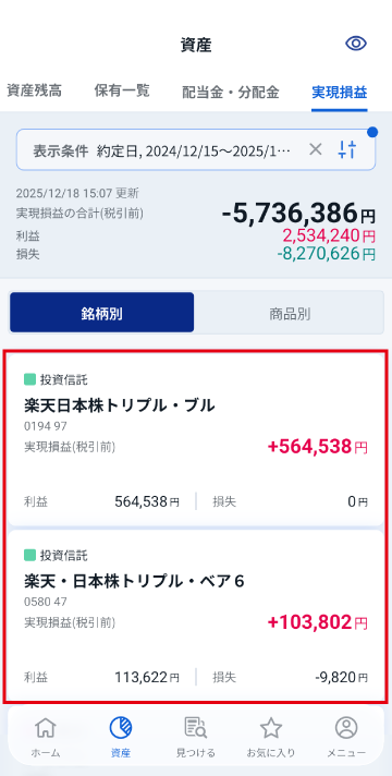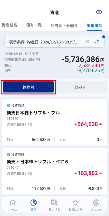 「資産」画面の「実現損益」画面で、銘柄別の実現損益を確認できます。