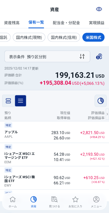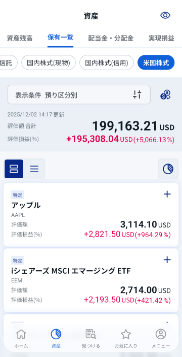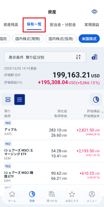 「資産」画面の「保有一覧」で、保有している銘柄を確認できます。