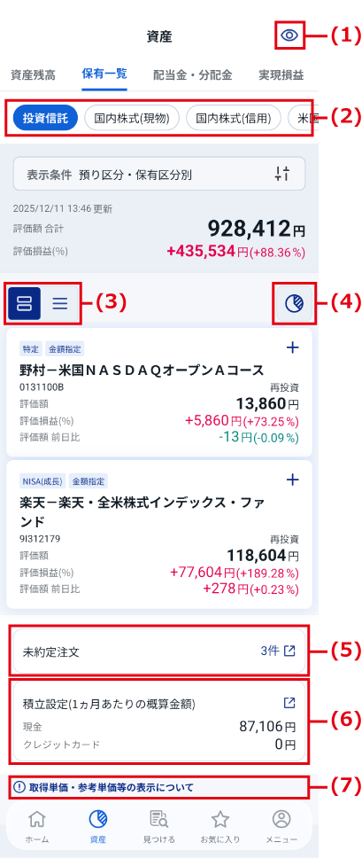サークルチャートをタップすると、各商品の評価額、資産構成比、前日比/率、評価損益を確認できます。