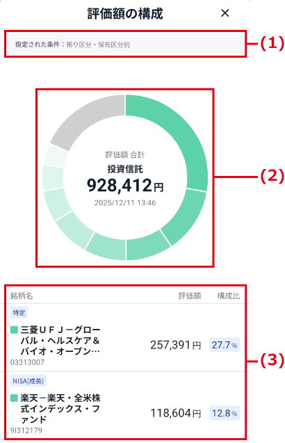 | (3) | 銘柄 | 銘柄ごとに、銘柄名、評価額、構成比が表示されます。 |