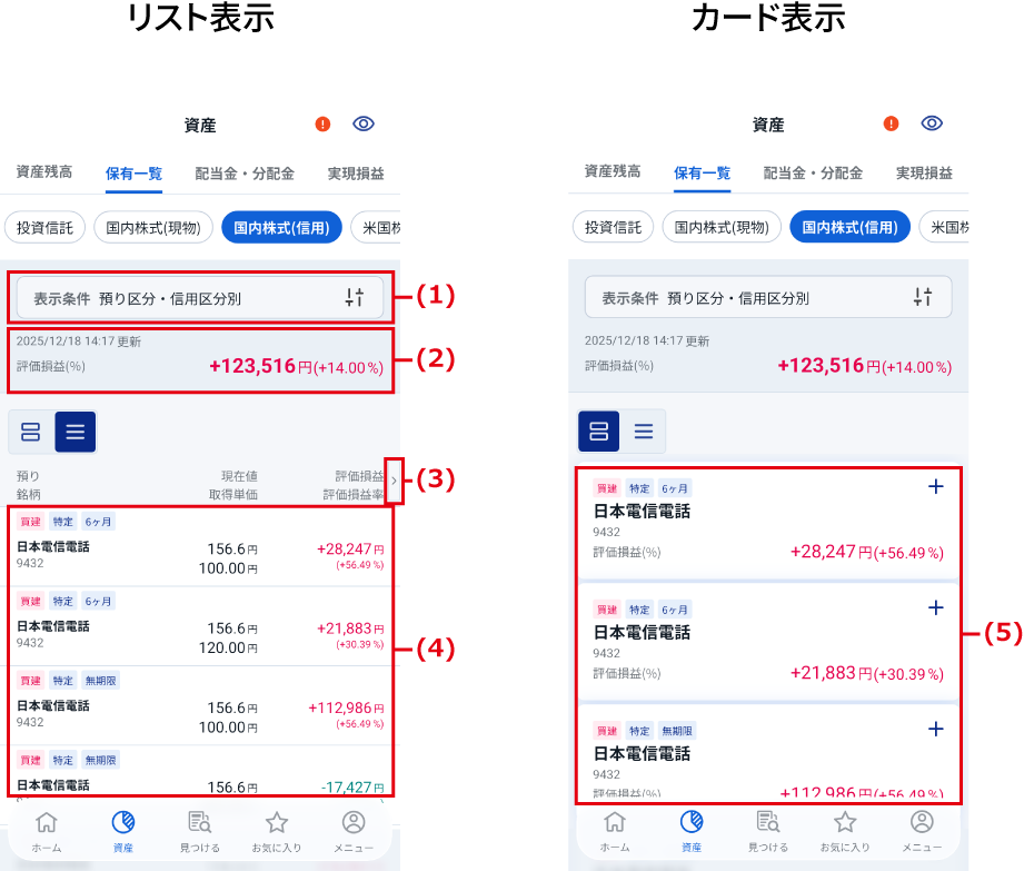 - リスト表示とカード表示の切り替えについては、「保有している銘柄を確認する」の「リスト表示とカード表示」を参照してください。