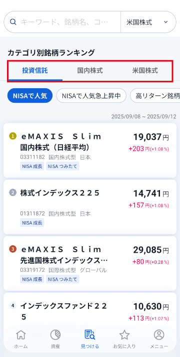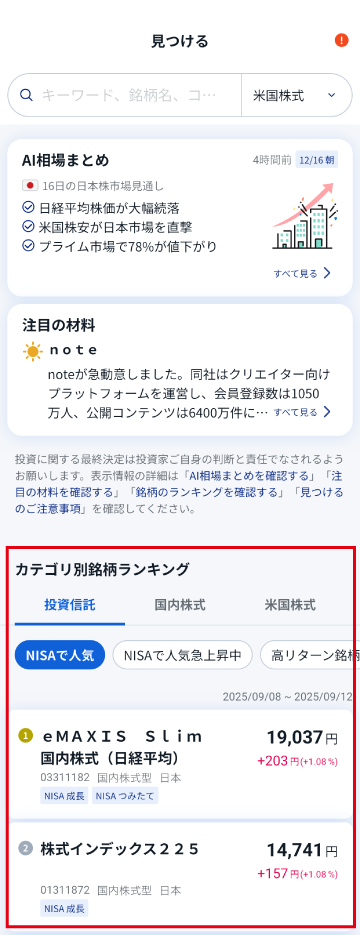 「見つける」画面が表示されます。「カテゴリ別銘柄ランキング」に銘柄のランキングが表示されます。