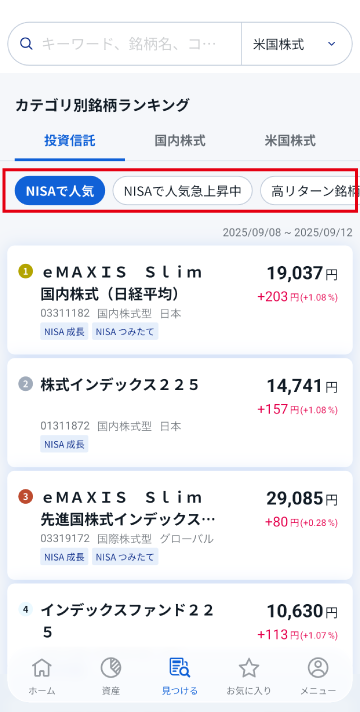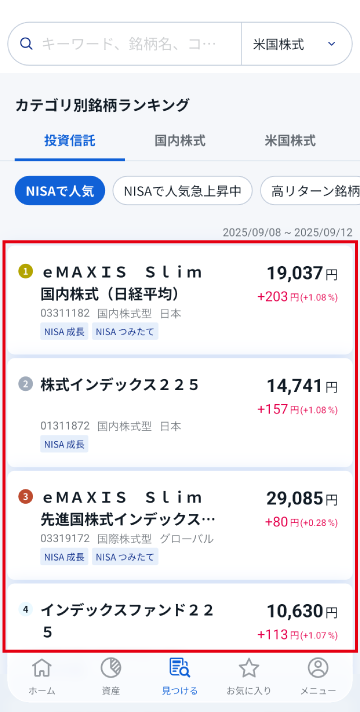 「見つける」画面で、カテゴリ別の銘柄のランキングを確認できます。