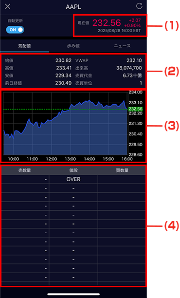 気配値では、各価格に対して注文が入っている数量が表示されます。左側に売注文、右側に買注文が表示され、リアルタイムで確認できます。