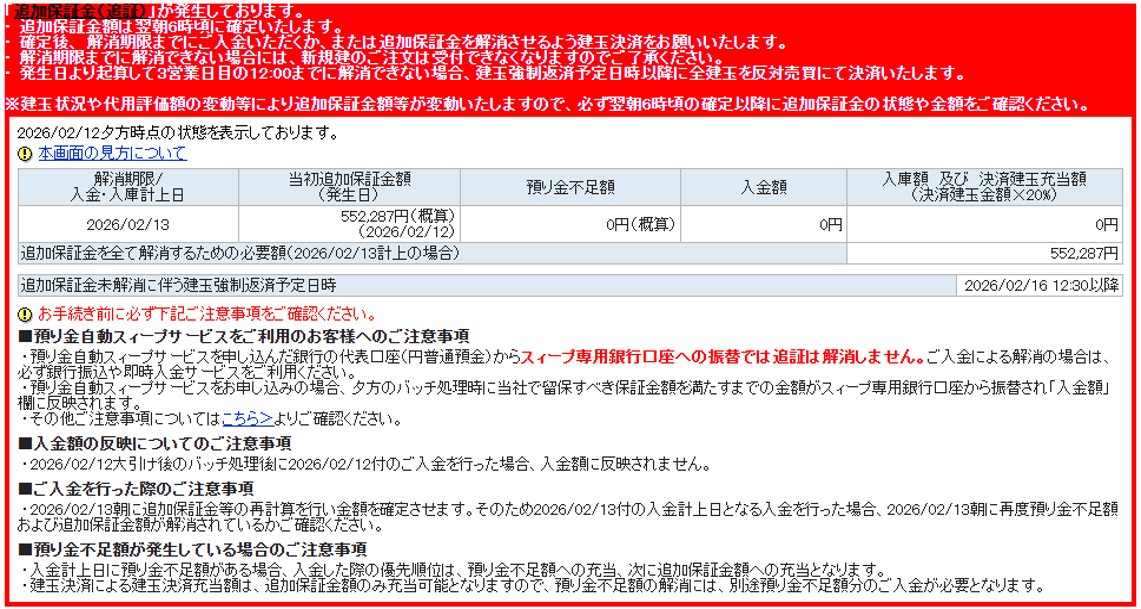 ※夕方の値洗いにおいて追加保証金が発生していなくても、翌日の朝6時頃のバッチ処理での確定により追加保証金となる場合がございますのでご注意ください。