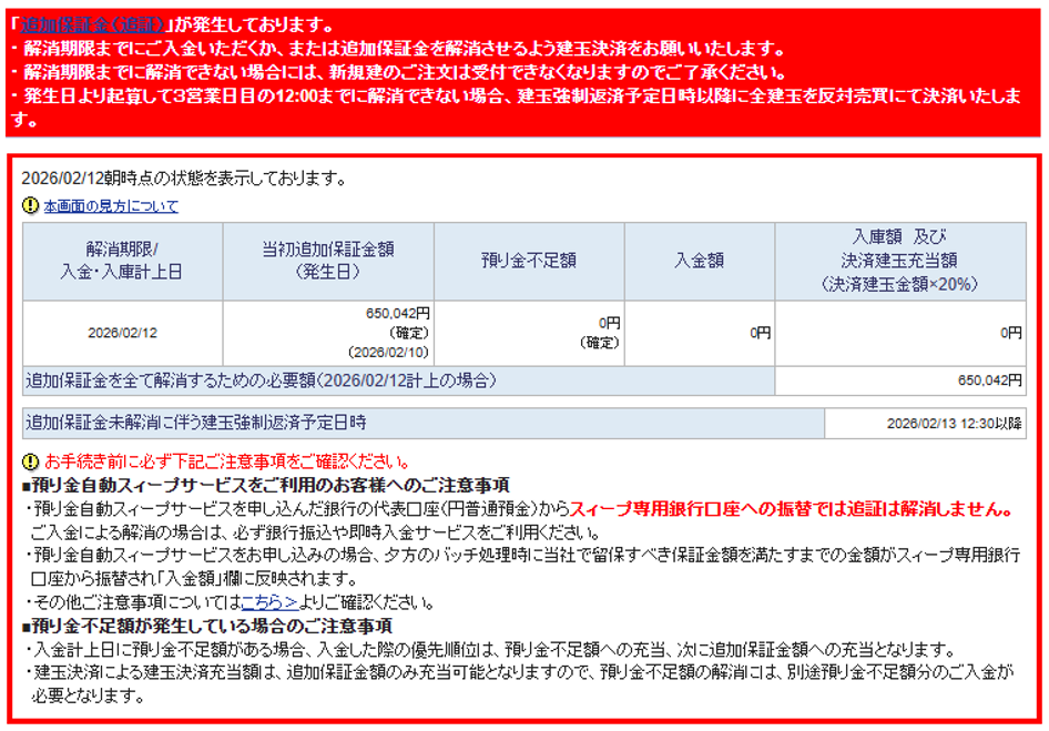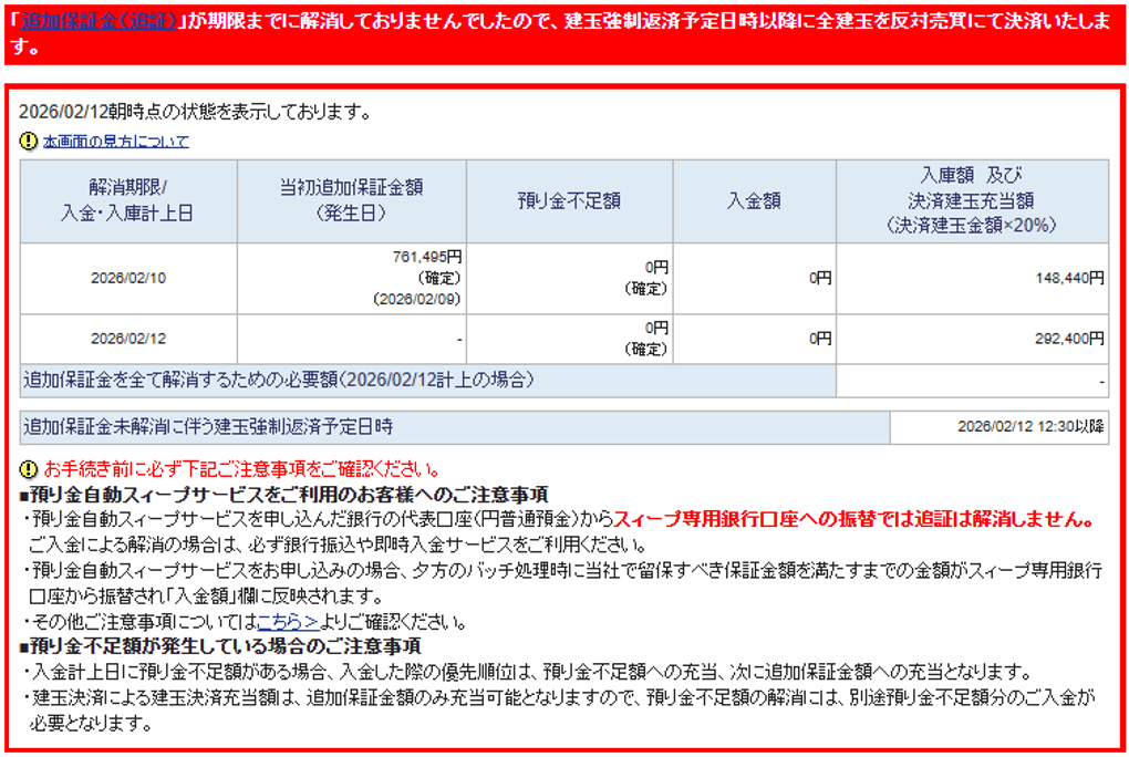 ※大引け後に行われるバッチ処理の後に、yyyy/mm/ddで表示している計上日の1営業日前の計上日となる入金が行われた場合、「追加保証金を全て解消するための必要額(yyyy/mm/dd計上入金の場合)」の額は更新されませんのでご注意ください。