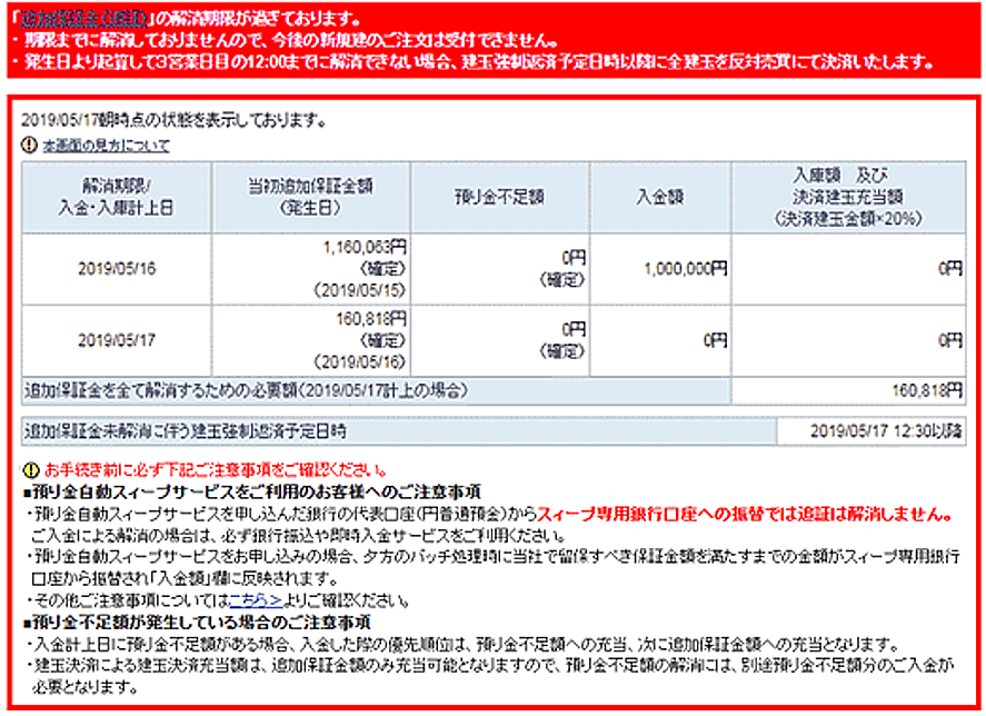 この日の正午までに計上されるように追加保証金を解消する為の必要金額を、ご入金等により解消いただけなかった場合、建玉強制返済予定日時以降に強制決済されます。 |