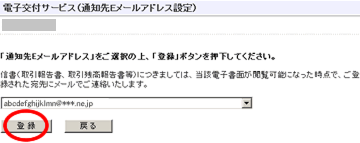 | 通知先Eメールアドレス設定でEメールアドレスを複数ご登録いただいている場合はプルダウンメニューよりご選択いただき「登録」ボタンを押下ください。 |