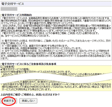 | 電子交付サービスの利用規約・ご注意事項及び免責事項の画面となり、内容をご確認・ご理解いただき「承諾する」ボタンを押下ください。 |