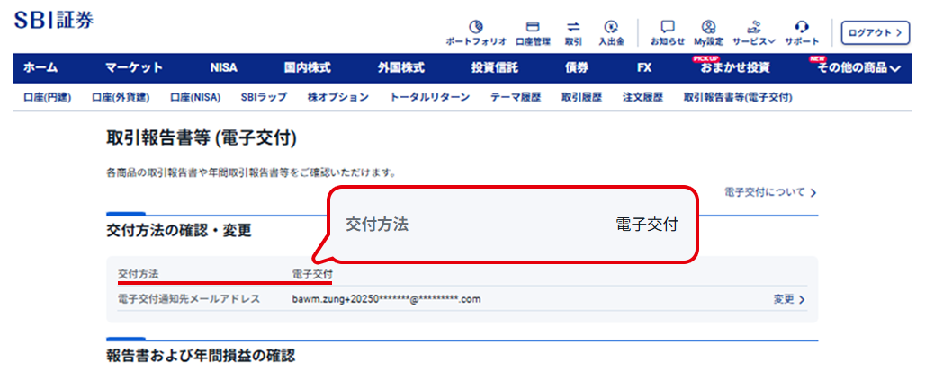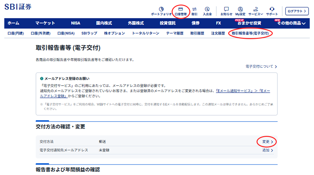 SBI証券WEBサイトログイン後の「口座管理」>「取引報告書等(電子交付)」>「変更」ボタンを押下し、次にお進みください。